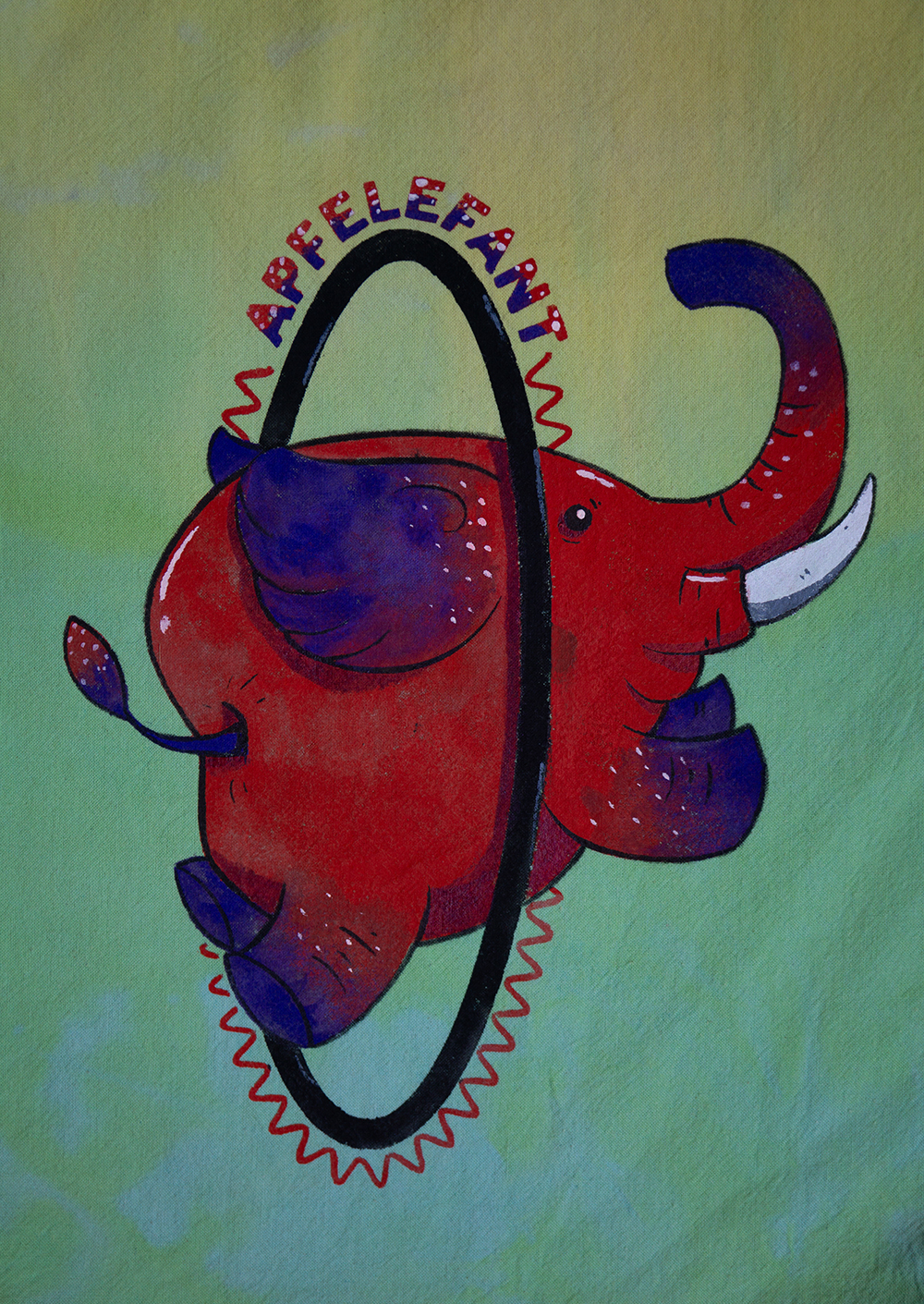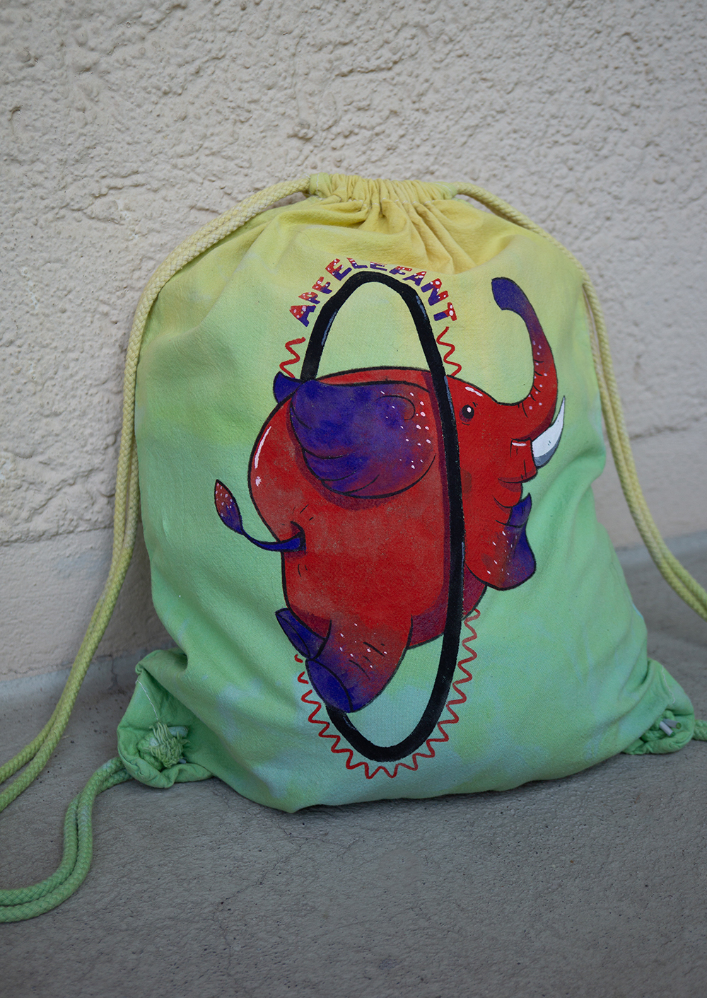 Rucksäckli mit billige Batik-Farbe gfärbt und mit Stoffarbe aagmalt. Täsche hani nöd sälber gmacht.