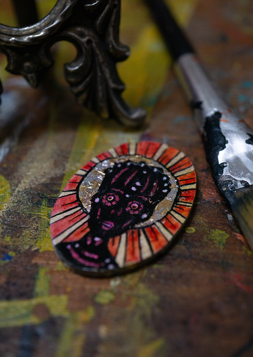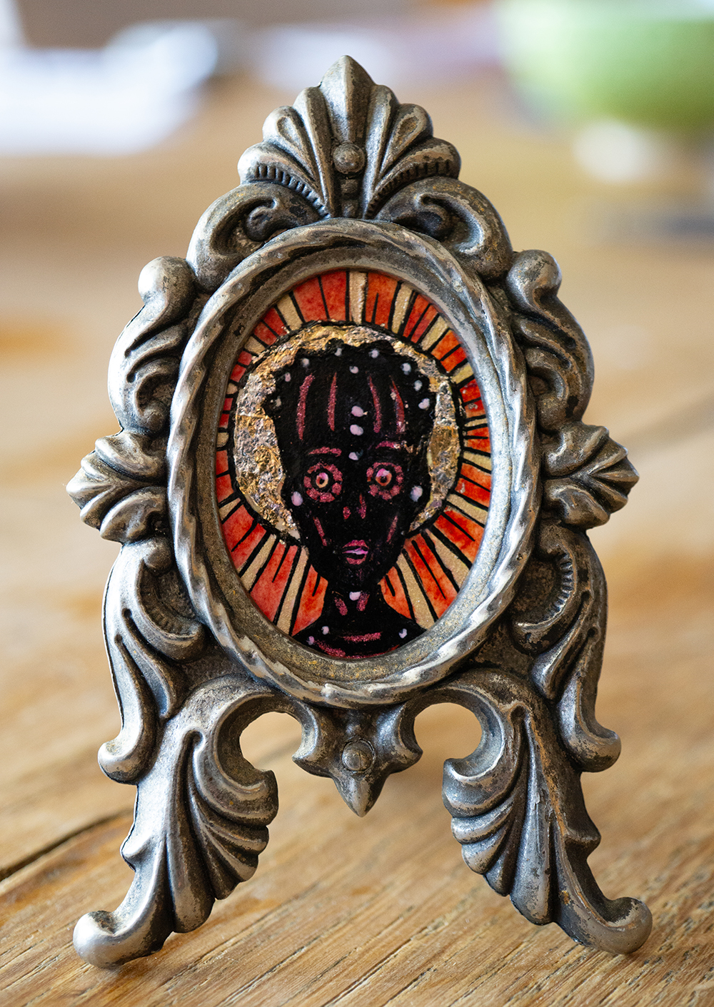 Gmalet mit Tusche uf es mit Papier bechläbts Kartönli. Und mit Gold-Fötzeli verziert.