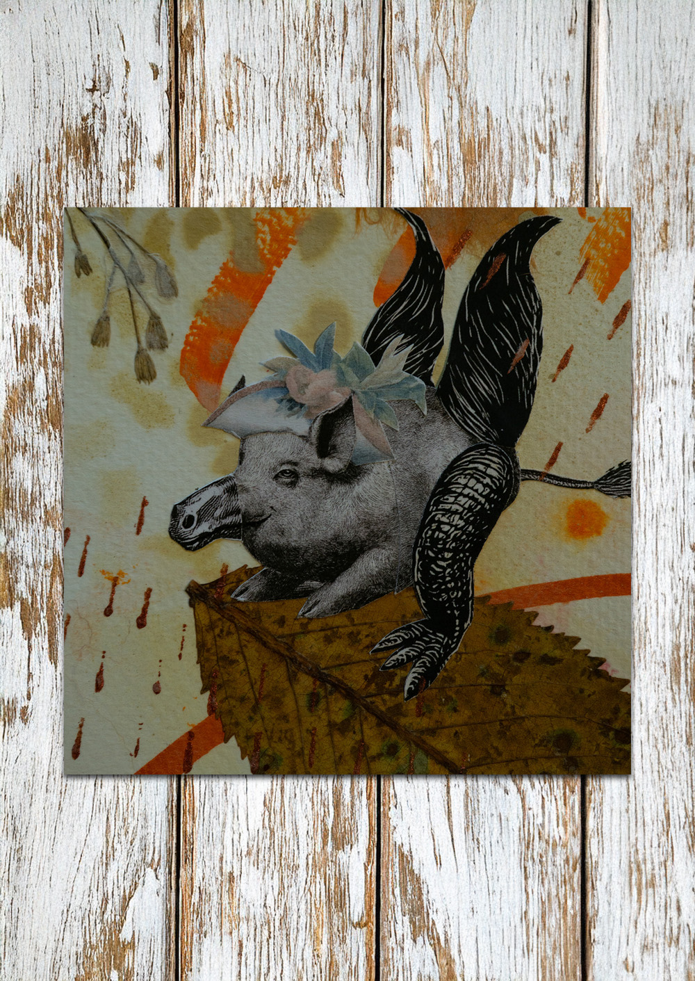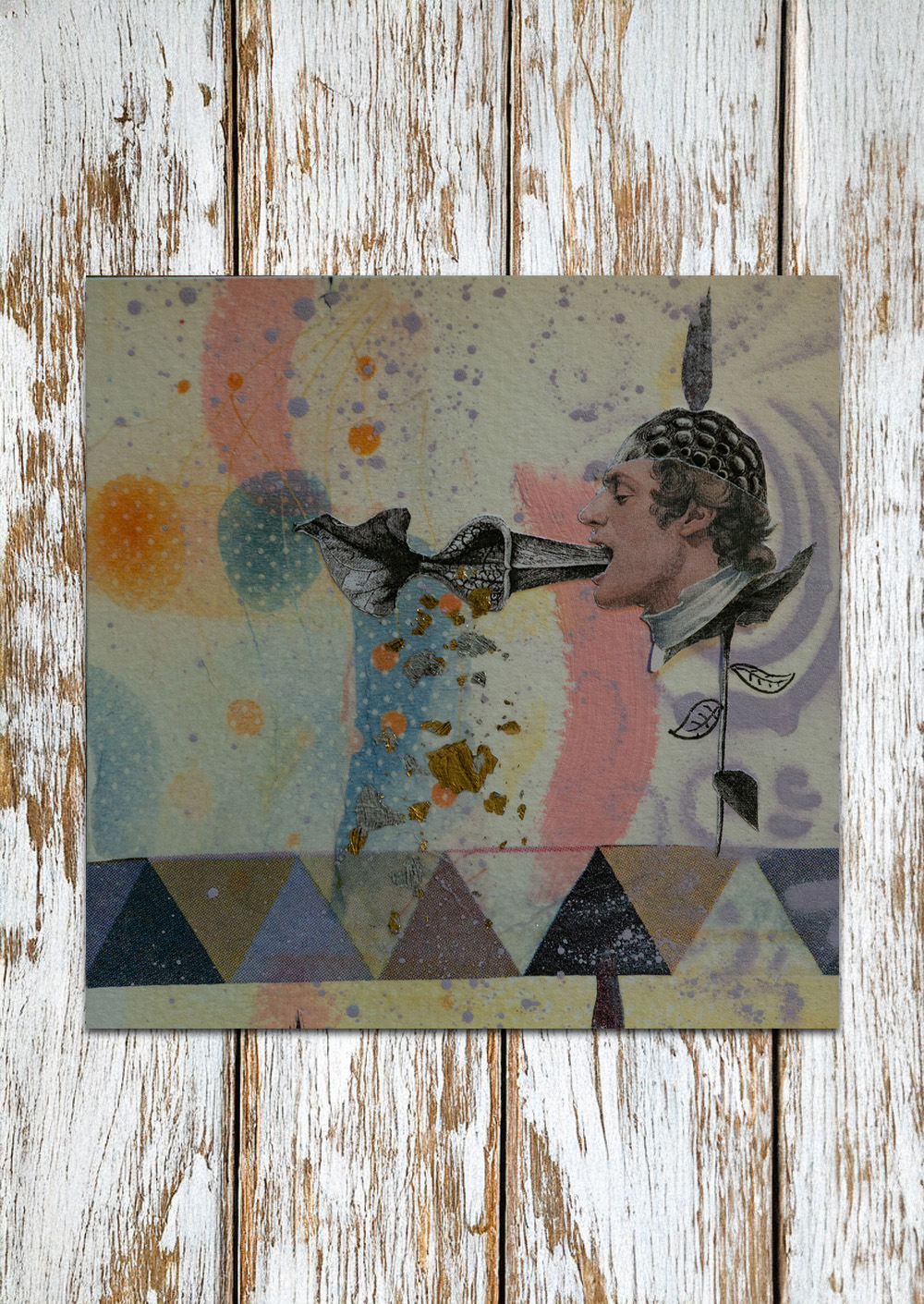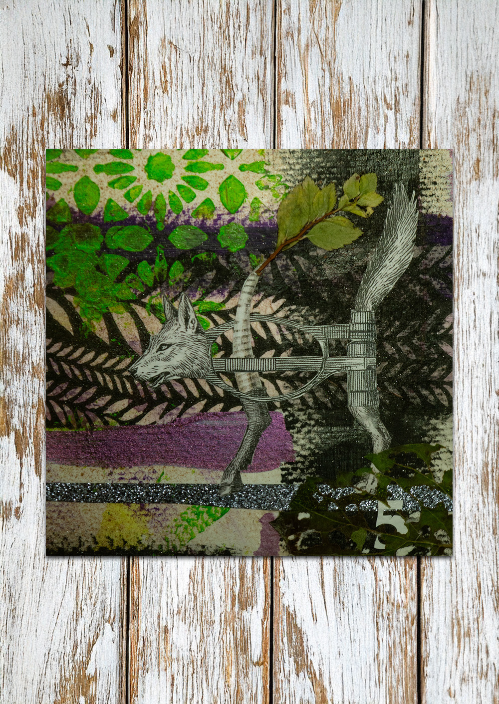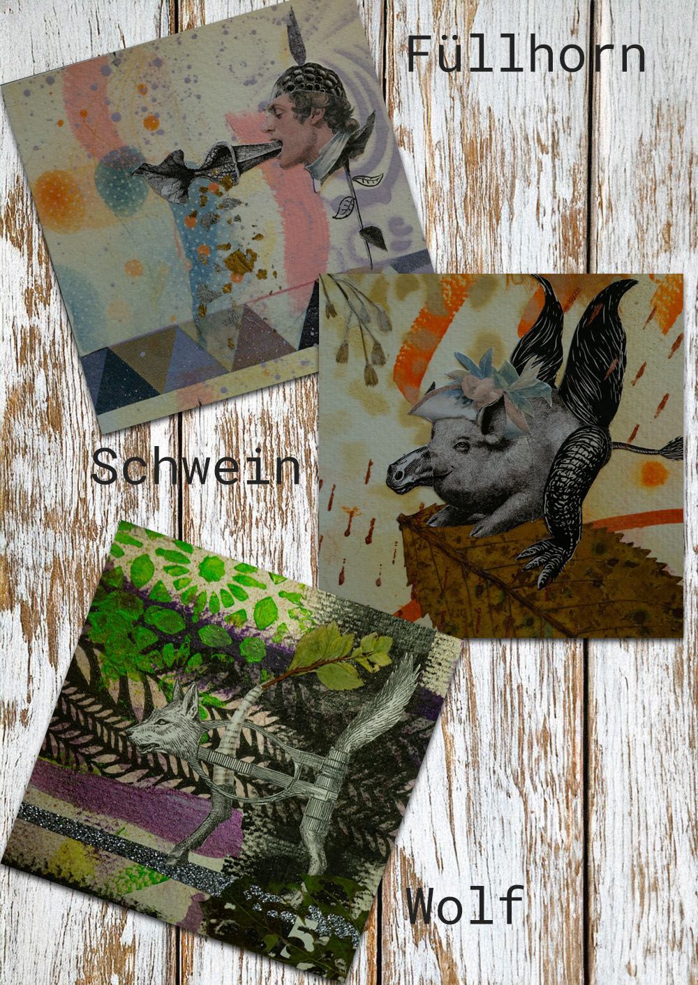 Hintergrund und Details gestaltet mit verschiedenen Techniken. Je nach Bild: Decoupage (Servietten-Technik), Filzstifte, Fineliner, Aufkleber, Gold/Silber Blättchen, gepresste Pflanzen und Tusche. Grösse ungefähr 10 x 10 cm.