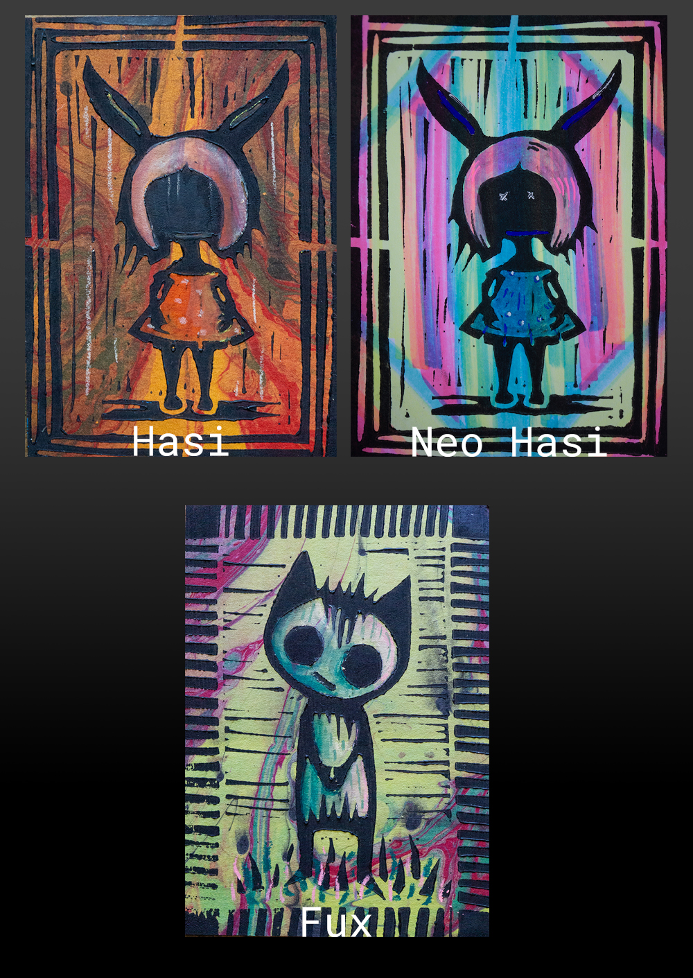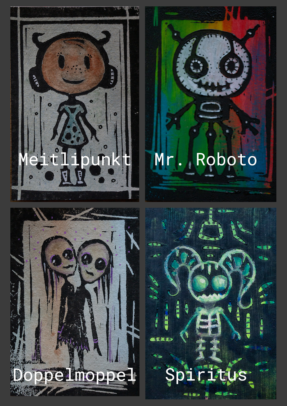 En Mini-Linoldruck für’s Portemonnai. Die Bildli sind nur 7 x 10 cm gross, ussert de Mottemaa, de isch mit 6.5 x 9.8 cm chli chlinner grate. Uf jede Fall öppe Sammelcharte Grössi.